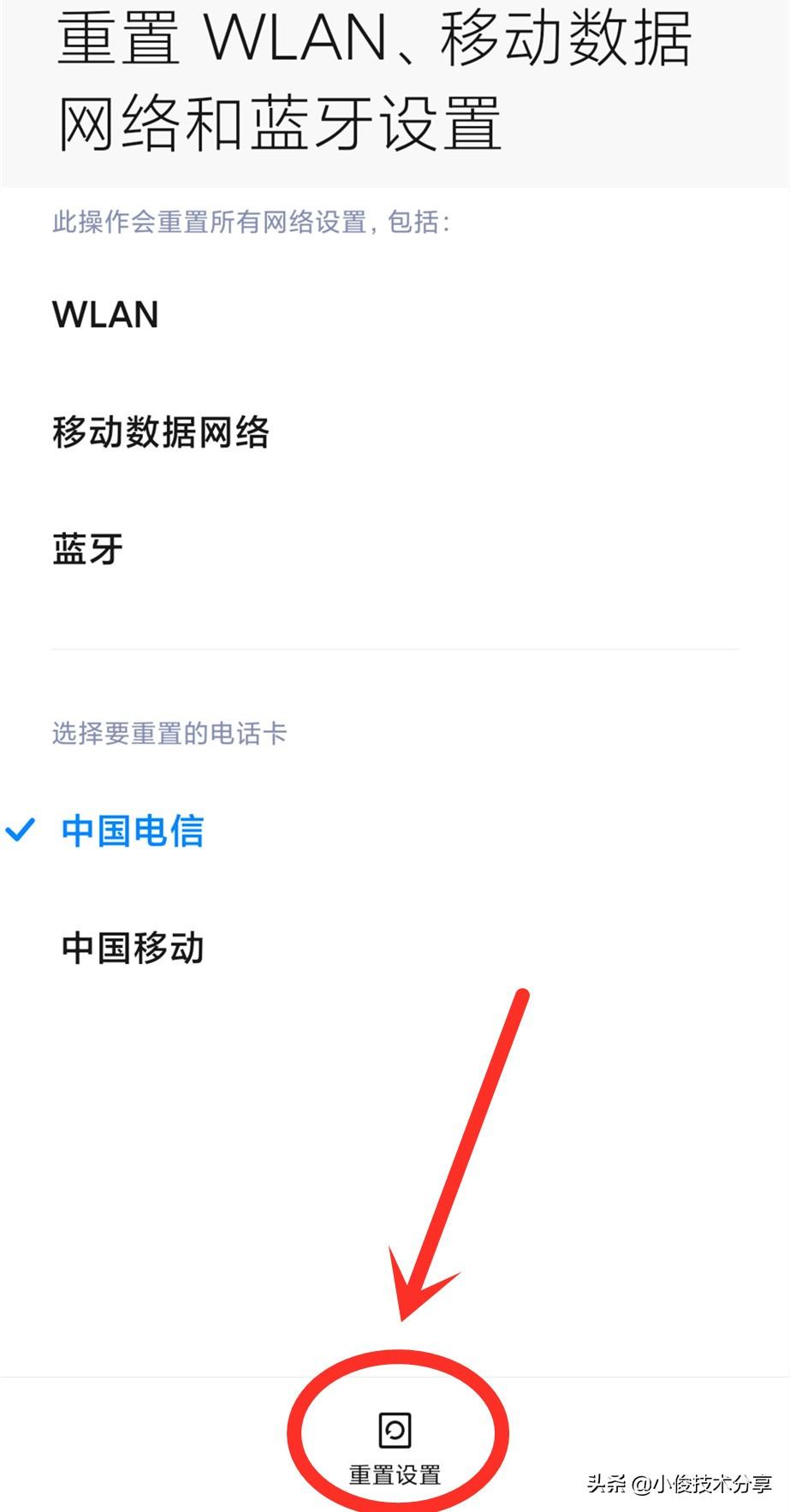 我们点击这个重置开关,点击打开之后,我们就可以选择需要重置的【手机卡】,哪张手机卡网速差就直接选择哪张,然后直接点击下方的【重置设置】