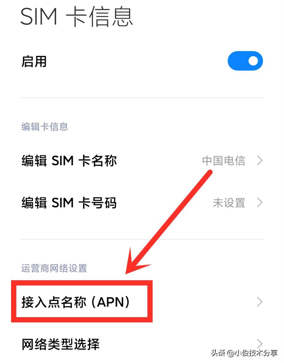 打开电信卡之后,往下会看到有个【运营商网络设置】,我们选择【接入点名称】