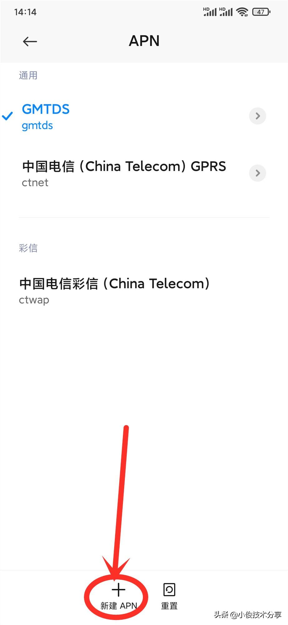接着也是选择【接入点名称】,接着再次点击【新建APN】,唯一不同的是【移动卡】需要将接入点名称设置为【GPRS】,APN设置为【cmnet】