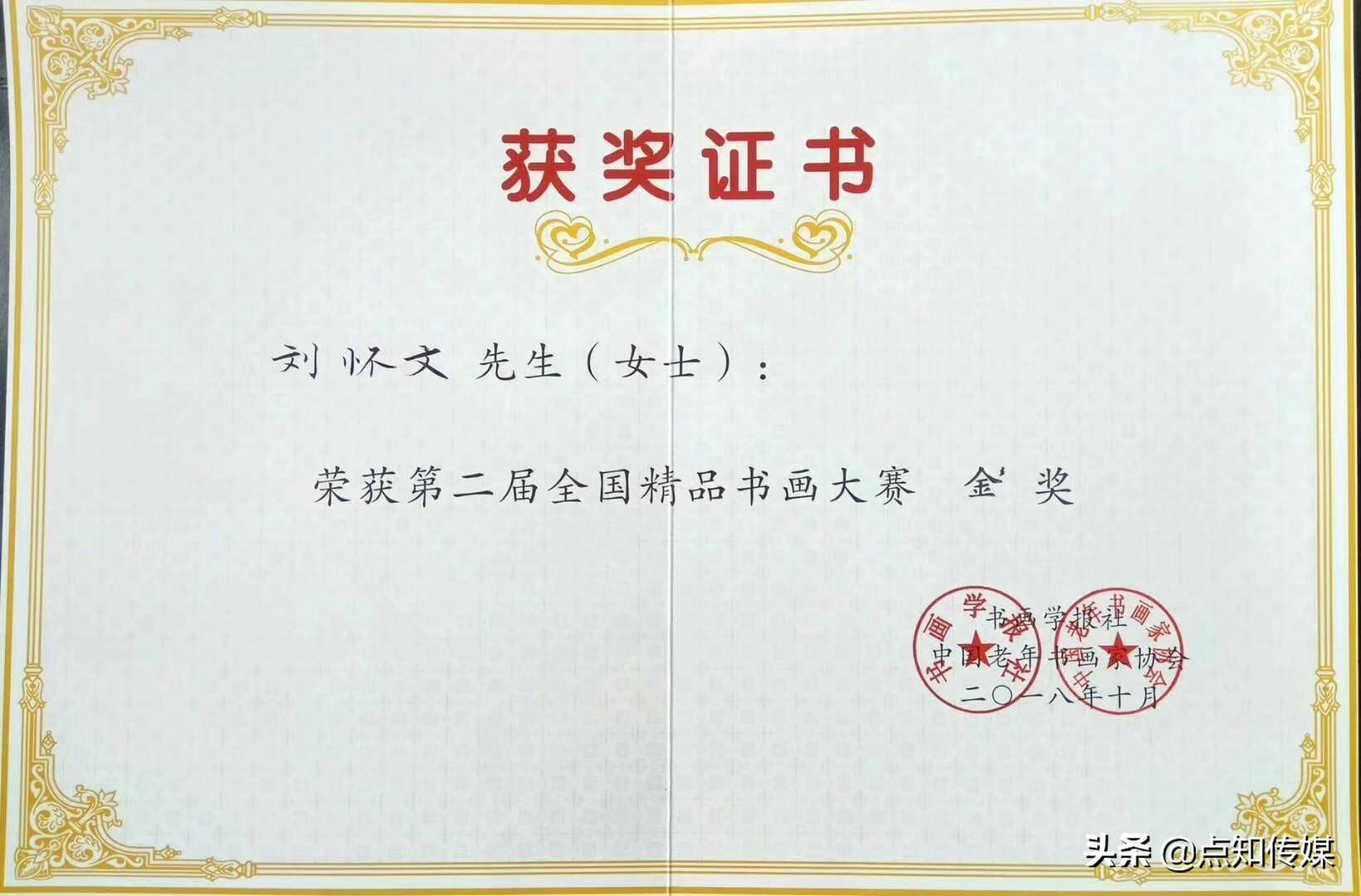 在第二届全国精品书画大赛中,滕州市书法家刘怀文荣获金奖,获奖作品入编《第二届全国精品书画大赛佳作集》。全国精品书画大赛是由中国老年书画家协会和书画学报社于2017年联合创办的检验全民书画学习成果和艺术实践水平的赛事活动平台。此次大赛共收到全国各地276家书画社团和个人有效投稿书画作品10968件,在“立足传统、提倡精品”的评审原则指导下,经书画学报社初评、大赛评委会专家组复评和终评等三轮严格评审,刘怀文书法作品脱颖而出,被评为金奖。