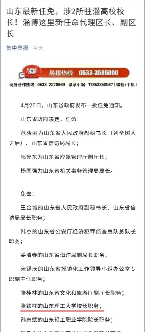 来自鲁中晨报4月20日的消息,在山东省政府发布的一批任免通知中,山东理工大学校长张铁柱被免去校长职务。但是在任免通知中,并未就免职说明原因,网友猜测可能与前日该校学生范某某虐猫案有直接关系。