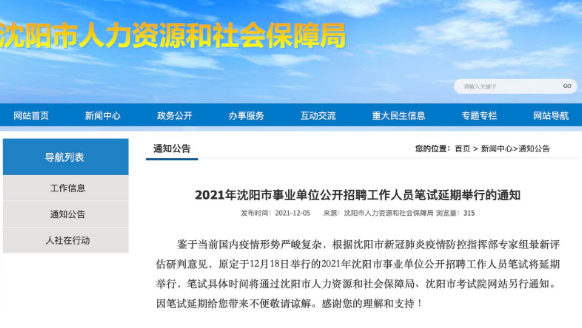 鉴于当前国内疫情形势严峻复杂,根据沈阳市新冠肺炎疫情防控指挥部专家组最新评估研判意见,原定于12月18日举行的2021年沈阳市事业单位公开招聘工作人员笔试将延期举行,笔试具体时间将通过沈阳市人力资源和社会保障局、沈阳市考试院网站另行通知。因笔试延期给您带来不便敬请谅解。感谢您的理解和支持!