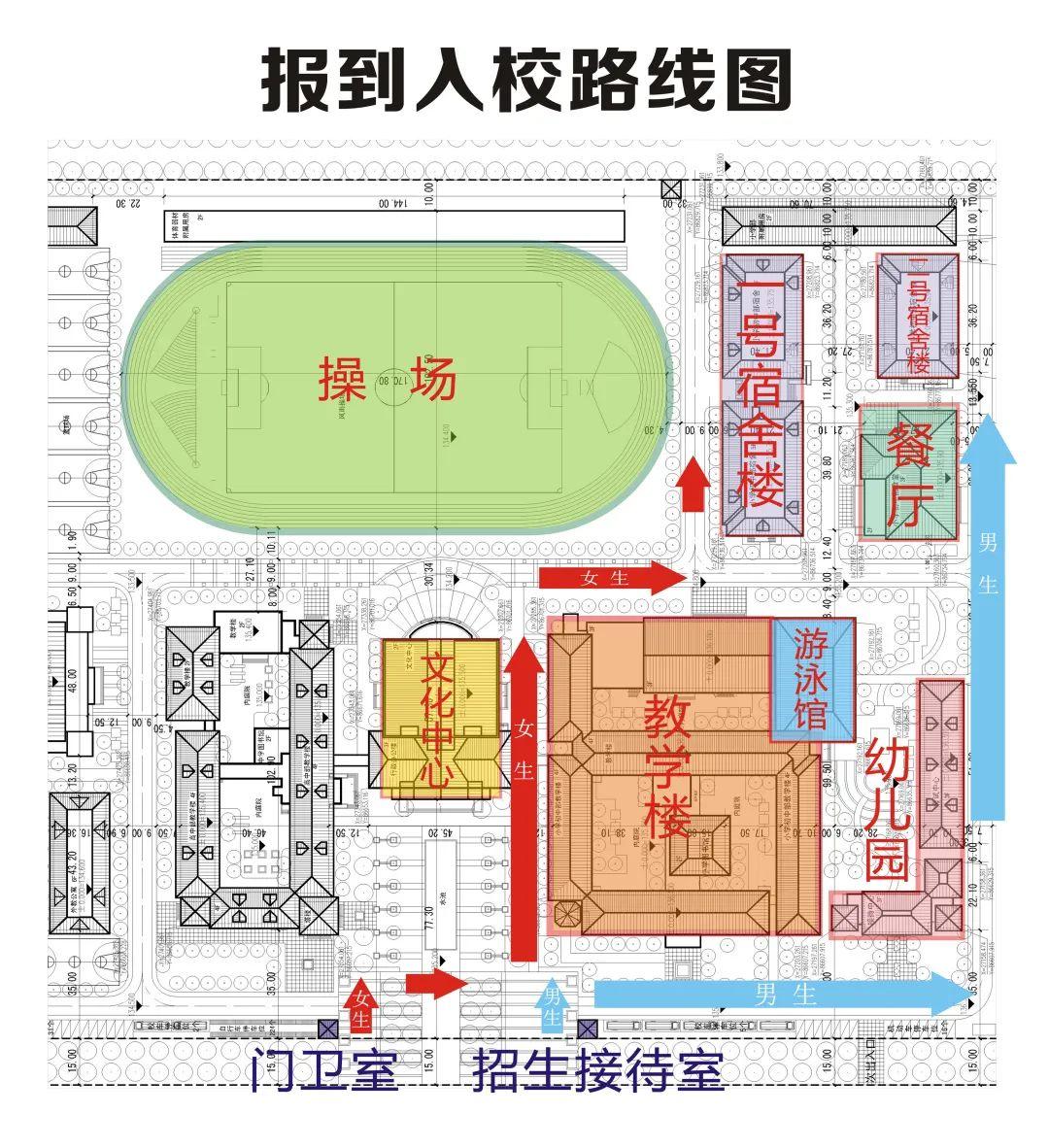 女生:大门-国旗广场-文化中心和教学楼中间道路宿舍中厅北门-宿舍楼东楼梯