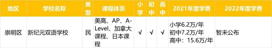 崇明只有一所国际学校新纪元,2022学费暂未公布。诺科静安校区2022学费同样暂未公布,可参考诺科宝山校区17.9万/年。