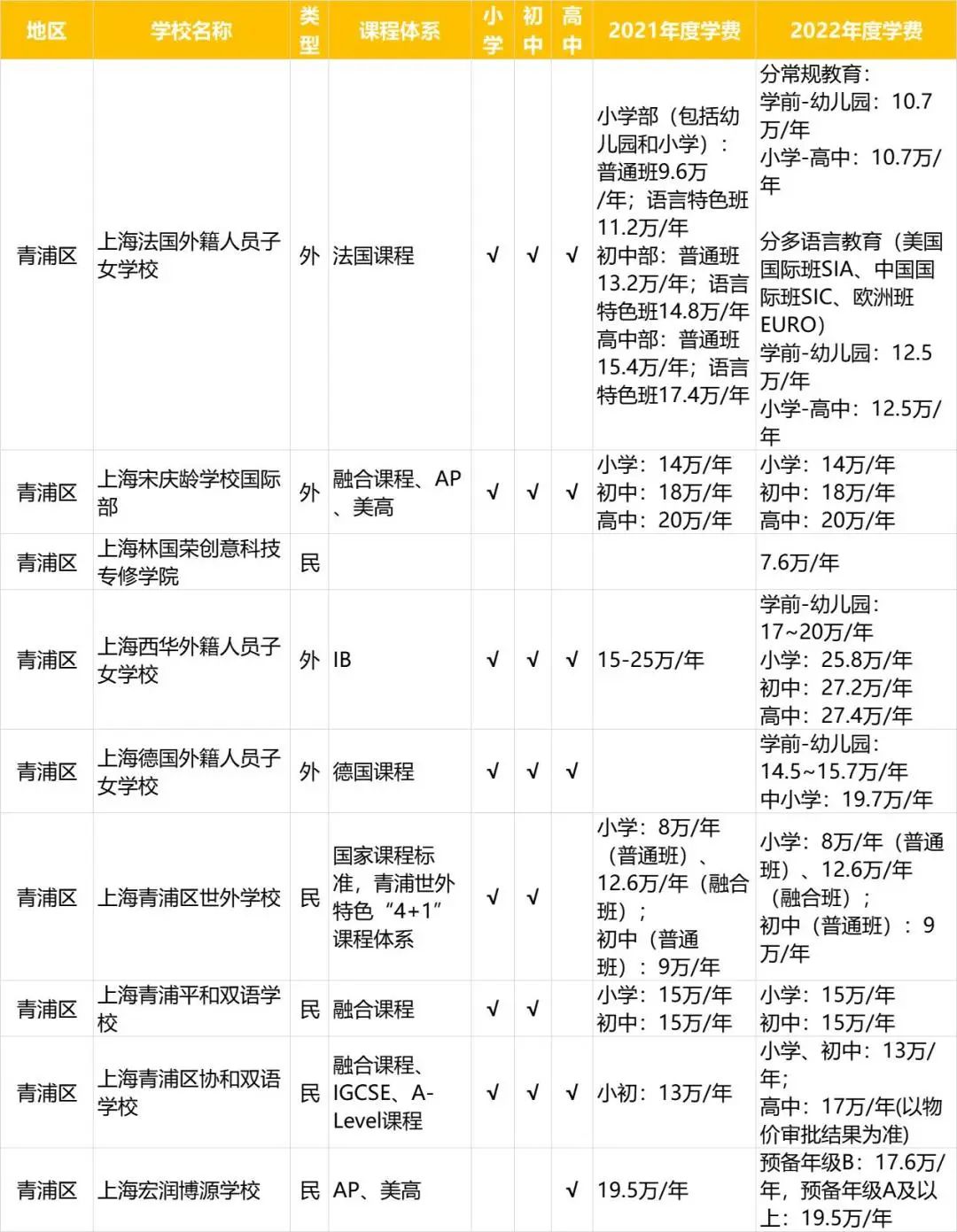 小初高阶段:青浦区很多学校都维持2021学费水准,包括青浦平和、宏润博源、青浦世外、宋庆龄学校等。而西华外籍最高学费上涨达到2万左右。