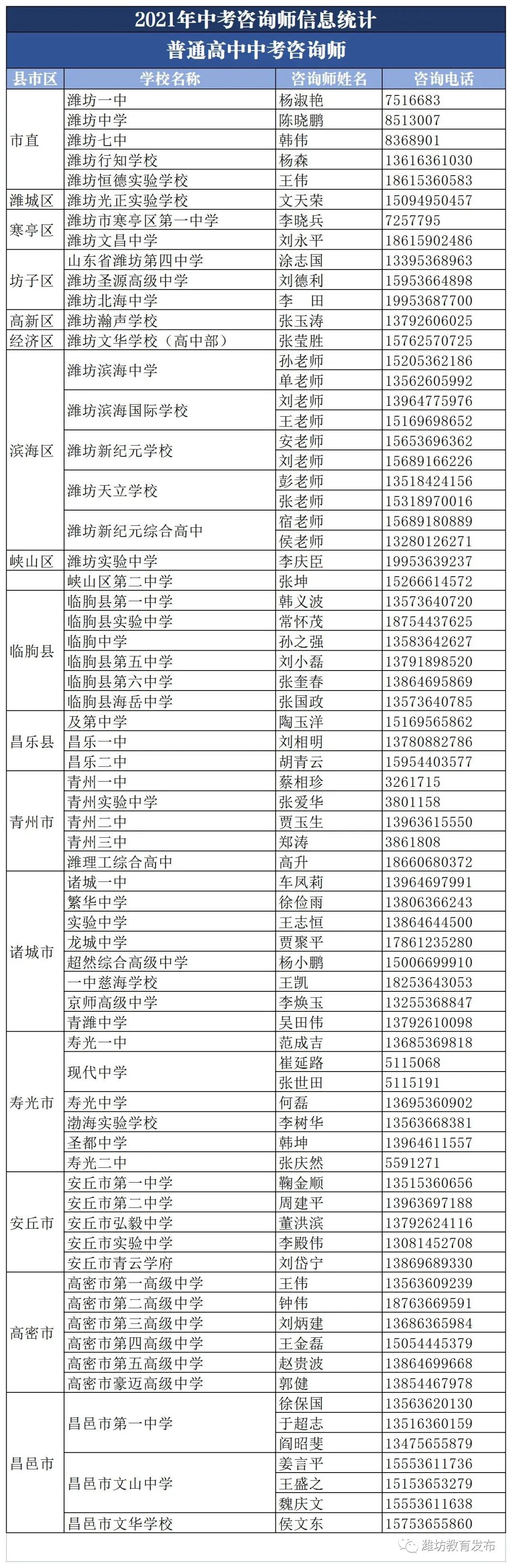 为了更好的服务广大中考考生、家长,便于家长咨询中考政策,我们在初中、高中学校设立了“中考咨询师”。现将全市各初中、高中学校中考咨询师名单汇总公布。考生和家长如有中考考试报名、志愿填报等相关政策需要咨询,可在工作时间联系。