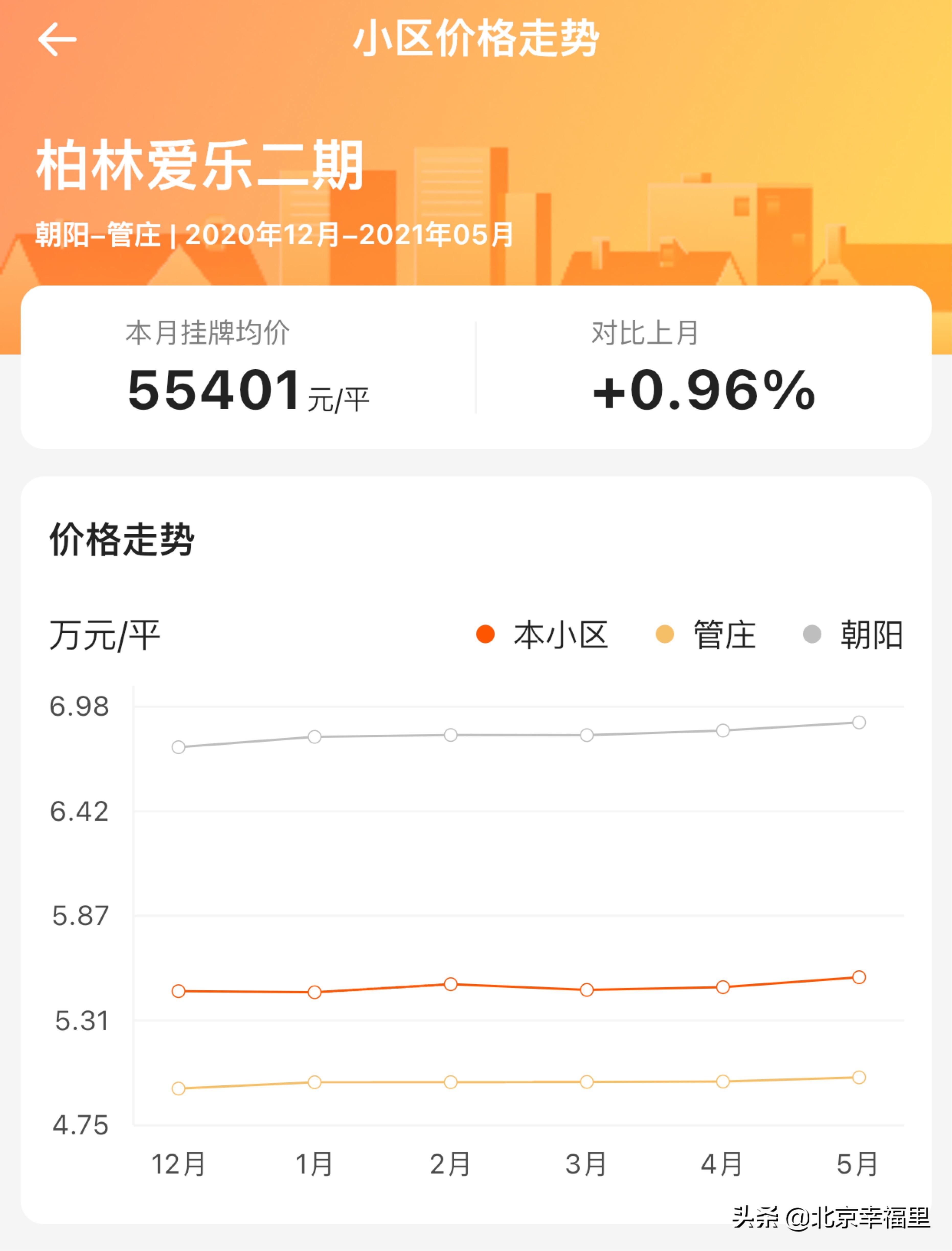 截至2021年6月1号,小区挂牌房源共42套,占全房源的1.6%。根据幸福里app查询,柏林爱乐二期5月挂牌均价55401元/㎡,环比上涨0.96%,从近6个月的价格波动趋势来看,该小区呈现稳中有升态势,但均在正常波动区间内。