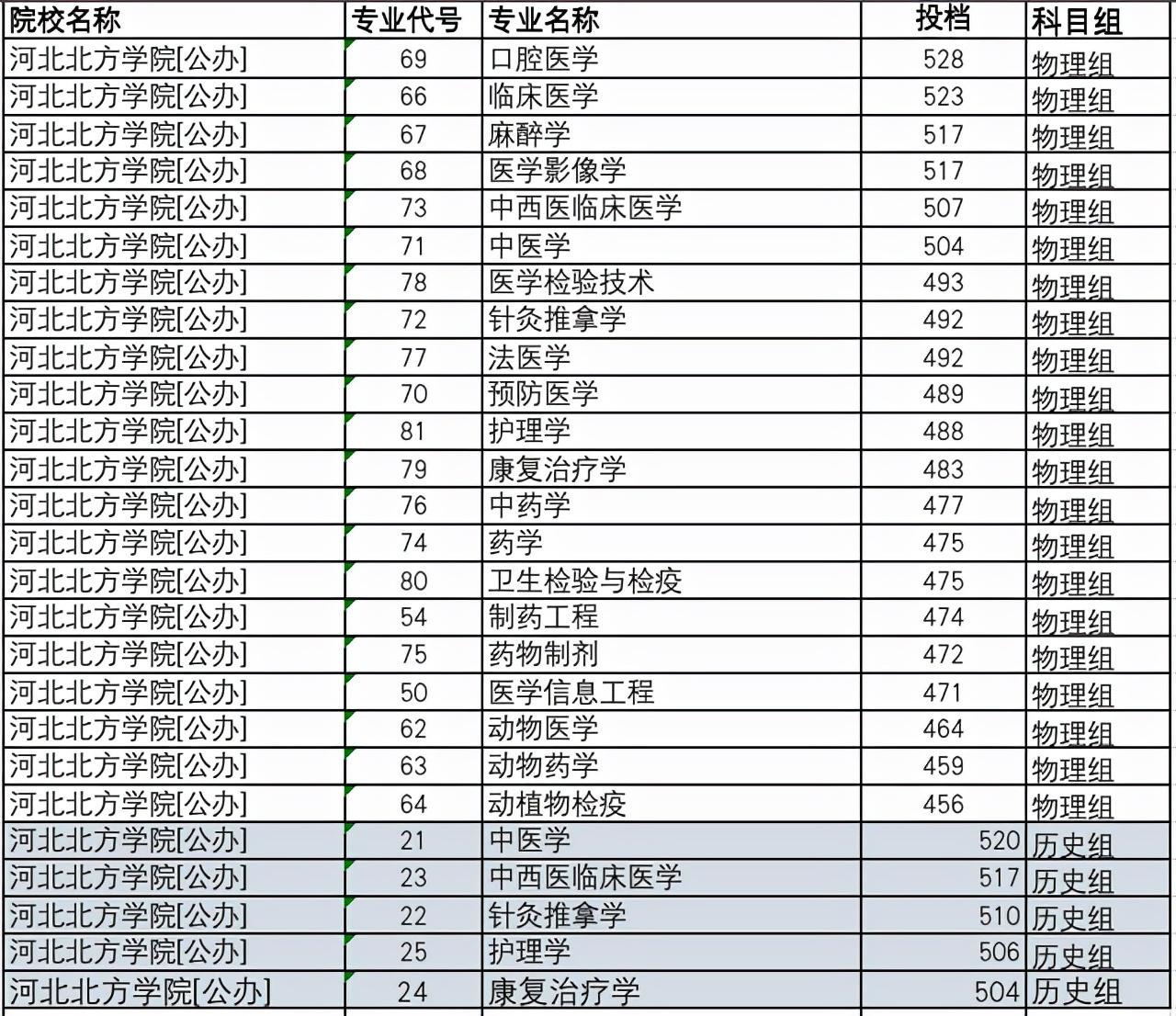 下面是河北北方医学院医学类专业2021年在河北省本科批各专业投档分情况:
