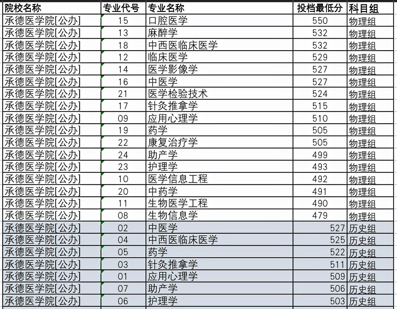 下面是承德医学院2021年在河北省本科批各专业投档分情况: