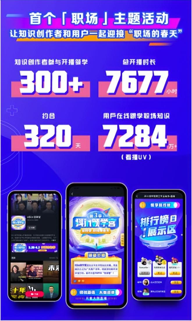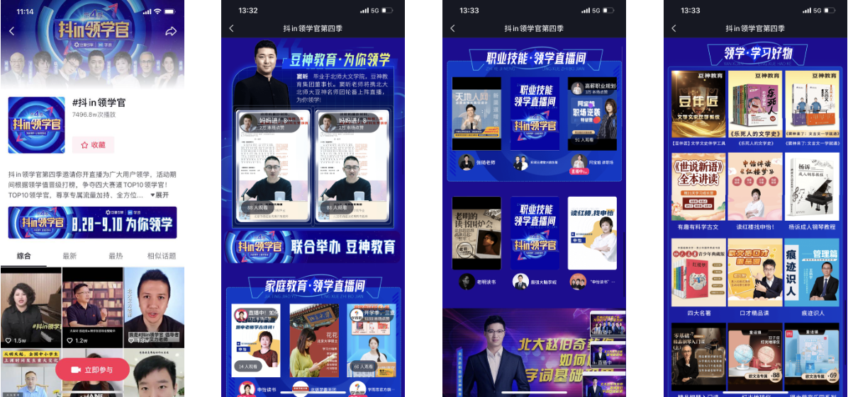 回望今年三四月,第三季「抖in领学官」结合春招背景,以“职场的春天”为主题,一举动员了超300位知识创作者开播领学,总开播时长达7677小时,吸引超7200万用户在线跟学职场知识。同时,第三季「抖in领学官」还首次打造了直播间IP“师说新语”,邀请教育专家携手职场先锋畅聊职场犀利话题,更邀请六位资深职场导师宣讲,首创“付费直播”领学新模式,一度引发行业热议。