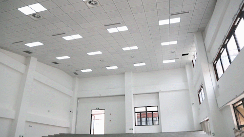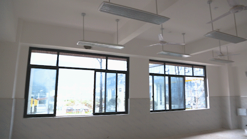 来到教室,虽然桌椅板凳还没有安装,但大致的样子我们已经能看到了,每间教室都非常宽敞,还配备了多台电风扇和护眼吊灯,让同学们能够安心学习。