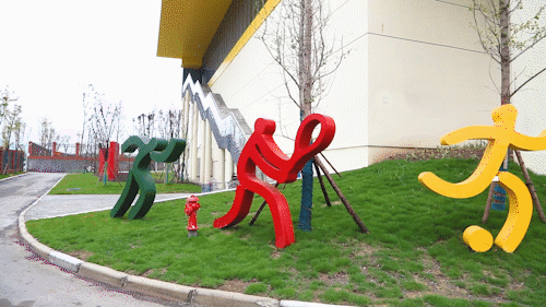 在体育馆的门口,小编还看到了很多五颜六色的体育小人,每个小人都在做着不一样的运动,洋溢着青春的气息。