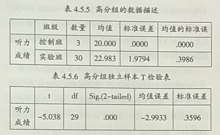从表4.5.1可以看出,29位受试处于低分组,其中23位来自控制班,而另外6位来自实验班,这两个班在听力成绩的均值上没有显著差异。同时表4.5.2也说明了低分组的学生在听力成绩上没有显著差异性(t=-.169,df=27,Sig.(2-tailed)=.859>0.05)。