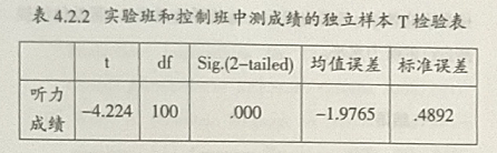 从表4.2.1和表4.2.2中可以看出,实验班学生中测的听力成绩比前测的成绩稍微有所提高,t=-4.224, Sig.(2-tailed)=0.000﹤0.05,说明这两个班的中测成绩具有明显的差异性。