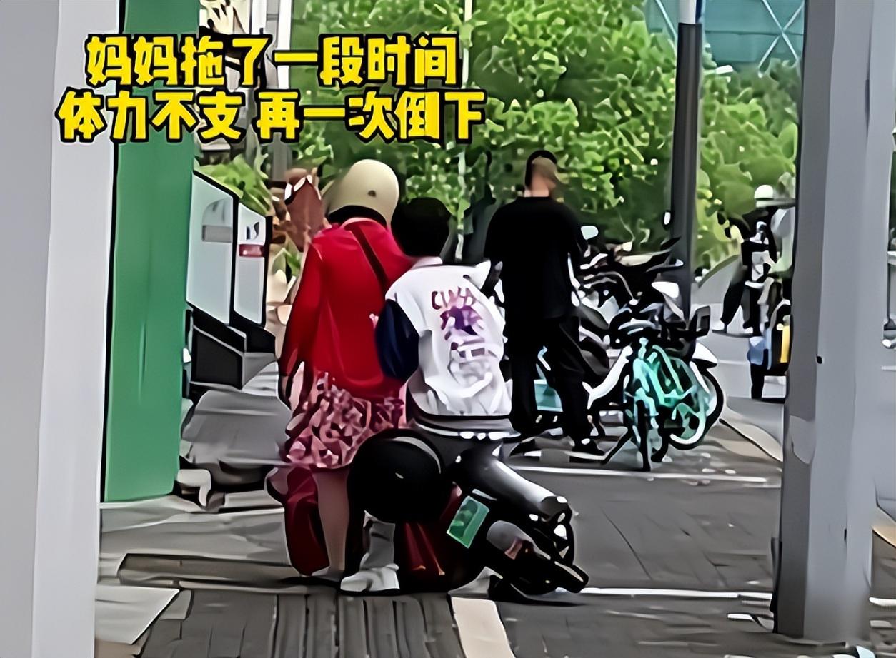 看到家长这样负重前行,通常网友们都会感慨于家长的不容易,而且说不定是这位小学生的腿脚不方便,所以对妈妈吃力地推着电动车和自己的行为熟视无睹,但是接下来电动车再次失去平衡,家长这次没能顺利的把车扶起来。