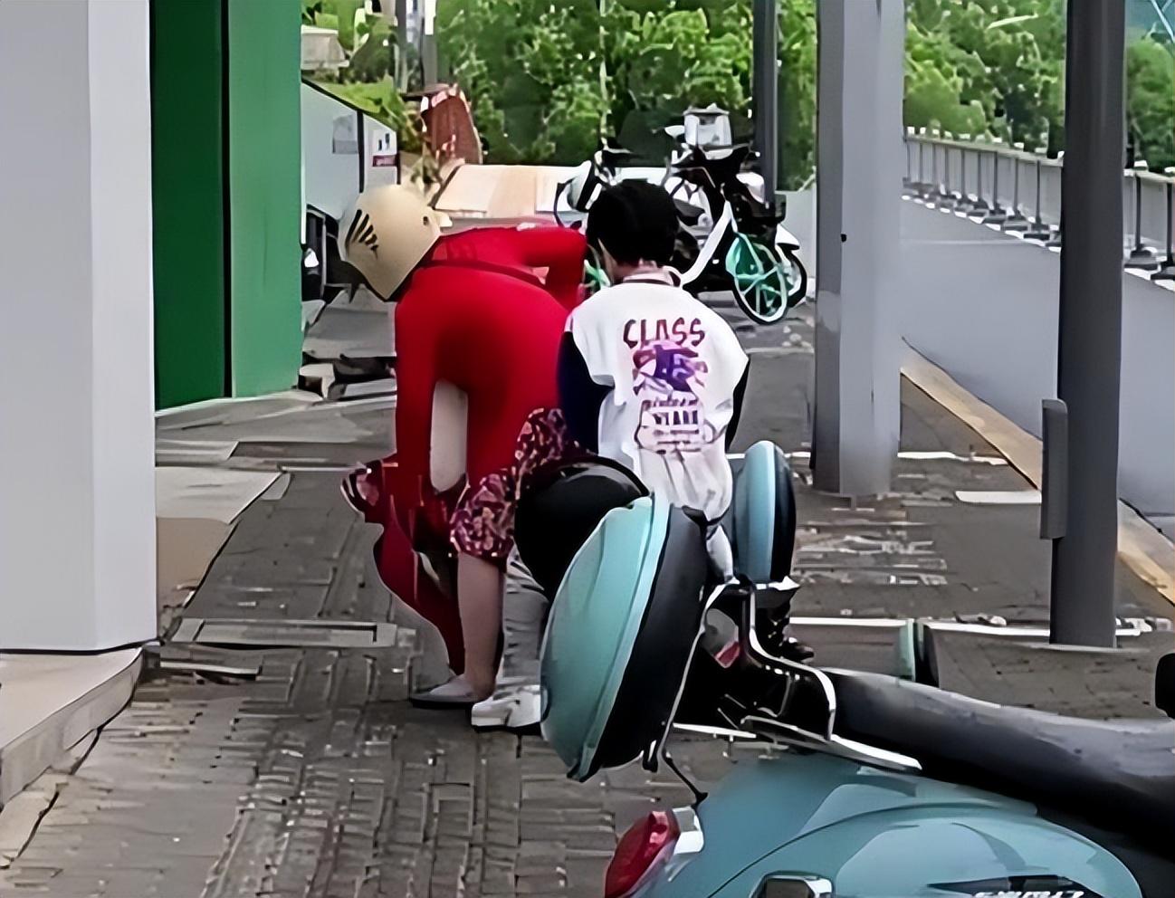 在一段很长的长坡路上,一位穿红裙的家长推着电动车载着读小学的儿子,因为那段路的坡度较大,电动车倒了,家长费力的把电动车抬起来,而坐在后面的儿子一动不动,还在低头玩手机。
