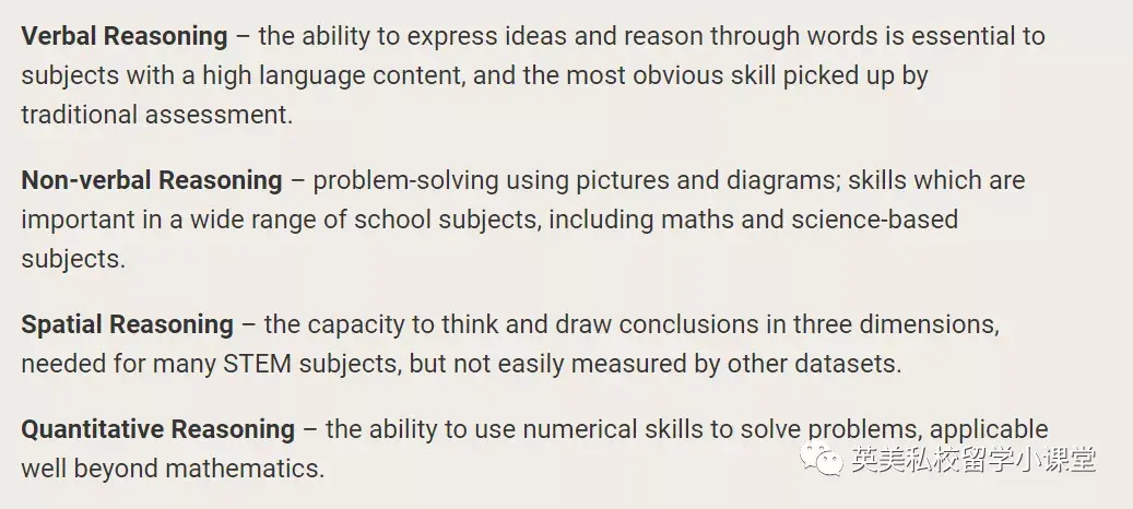 CAT4测试属于GL assessment,主要考查文字推理(verbal reasoning)、图形推理(non-verbal reasoning)、空间推理(spatial reasoning)和数量推理(quantitative reasoning)。