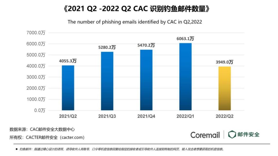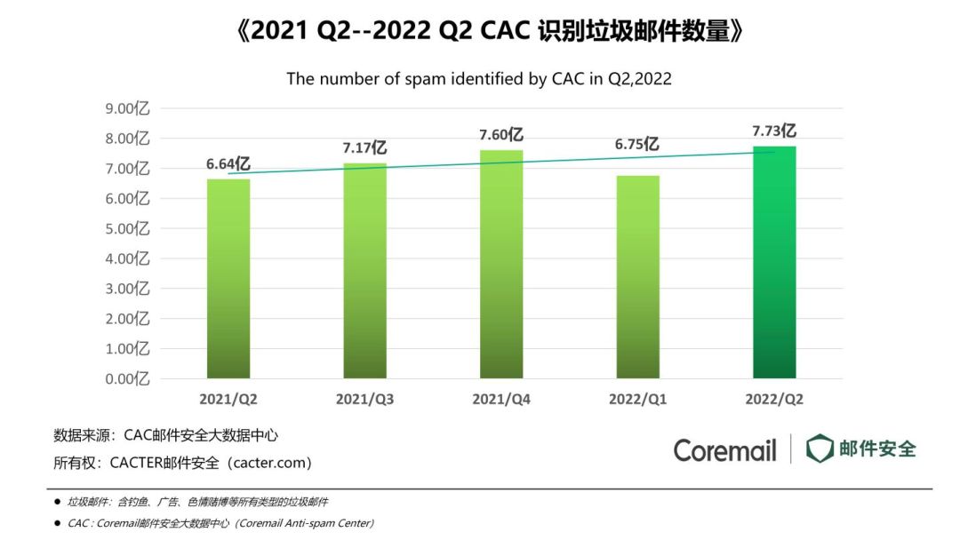 根据《2022年Q2企业邮箱安全报告》,Q2全国企业邮箱用户共收发各类垃圾邮件7.73亿封,环比上升14.50%,同比上升16.55%。