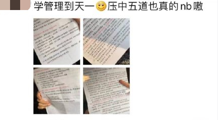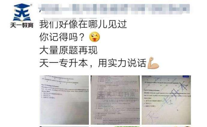 “今年管理(学)的题偏,后面大题基本都是马工程的,本没几个人会。但考完试天一(注:一家辅导机构)的朋友说她们vip班的原题大题(和考题)一模一样,顺序都不变的。”该名考生还表示,名为“英才专升本” (注:一家辅导机构)的机构几乎押中了整张试卷的题目。