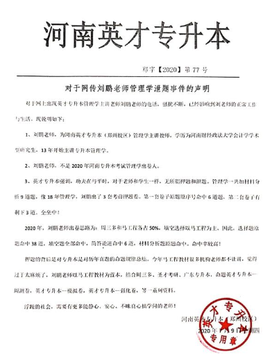 英才专升本郑州校区于7月9日发布了《对于网传刘鹏老师管理学泄题时间的声明》。