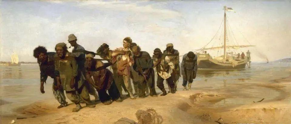 《伏尔加河上的纤夫》是列宾的代表作也是成名作。为了创作这幅描绘沙皇统治下俄国人民痛苦生活的作品,他两度到伏尔加去,深入观察纤夫生活,使画面上的纤夫既是生活在社会底层受压迫的人,又是具有坚强毅力的生活的强者,在构图上列宾利用了沙滩的地形和河湾的转折,使11个纤夫犹如一组雕刻群像,被塑造在一座黄色的、高起的底座上。