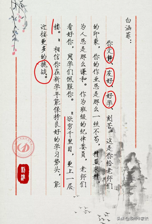 这里的老师利用休息时间主动辅导学生不说,每个学期末的学生评语也都是老师亲自手写家书。一个个“颜值高”、趣味足的私人订制版期末评语,寥寥数行却趣味盎然。“一书一世界”,美丽的文字一目了然地勾勒出每个学生的个性……