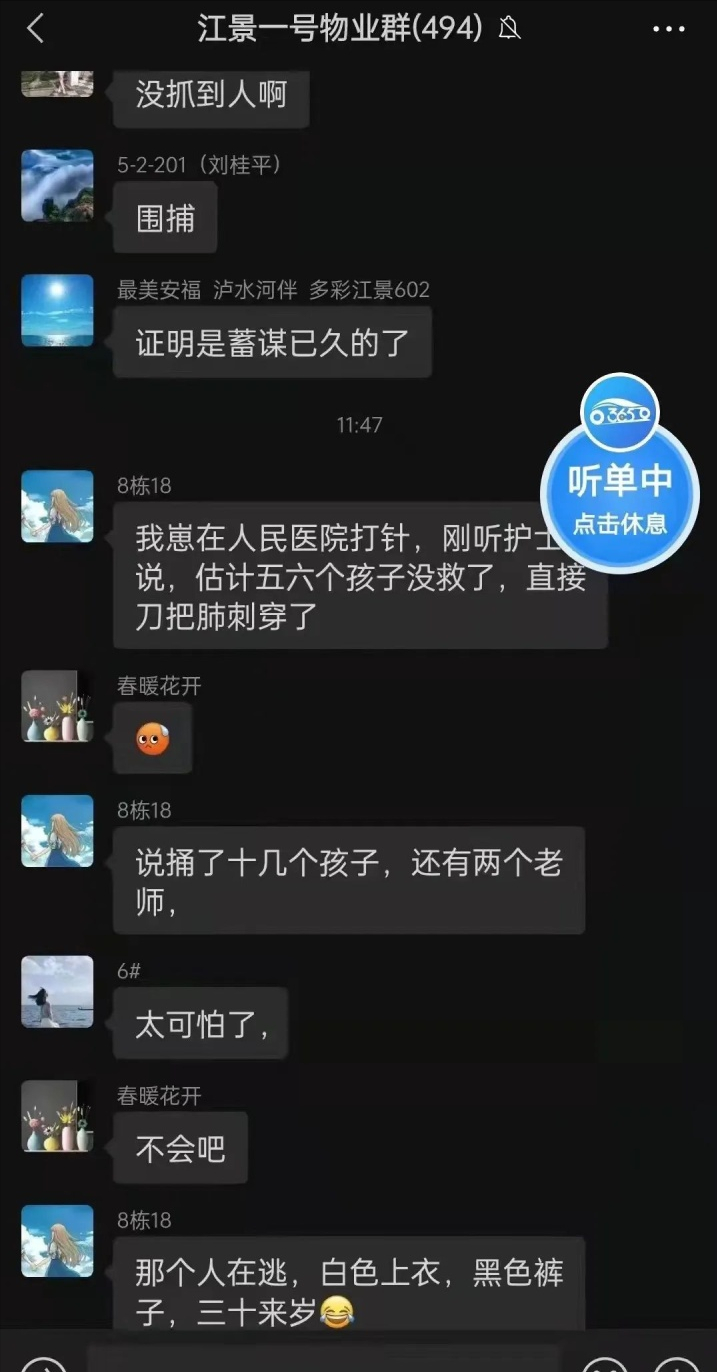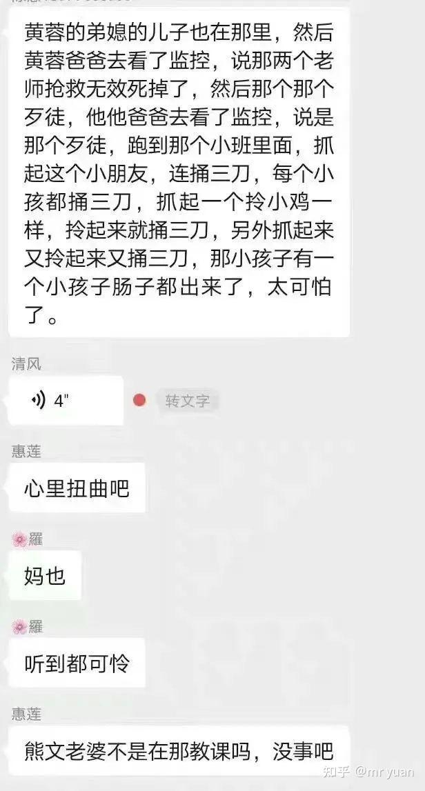 通过网友提供的聊天截图,大致了解到了凶手的行凶过程,手段极其残忍,真的令人发指!据知情人透露,期间2名老师发现后,想要阻止,奈何阻止未成,被嫌疑人捅伤倒地。此后嫌疑人开始对孩子下手,大到6岁小到3岁,够得着的一个没放过,无差别地进行犯罪。最终,到目前为止造成老师幼童3死6伤。并且从视频中可以看出凶手在行凶完毕后,居然非常淡定的步行离开幼儿园!