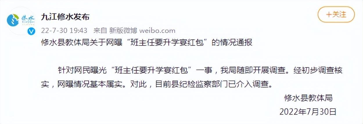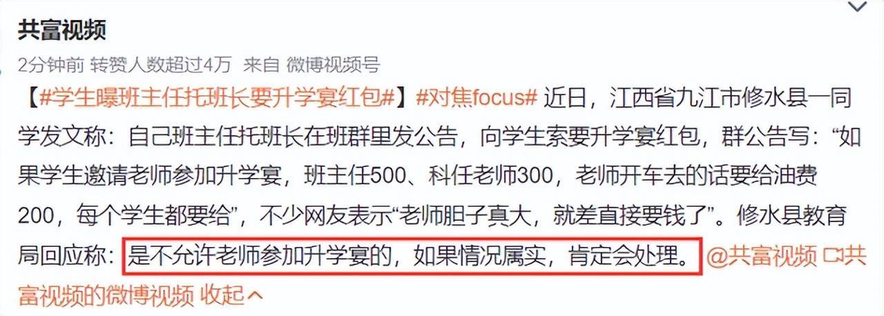关于该班级班主任公然向学生索要升学红包的消息不胫而走,并在网络上引发热议。面对舆情,当地教育局不得不出来回应,明确表示:是不允许老师参加升学宴的,如果情况属实,肯定会处理。