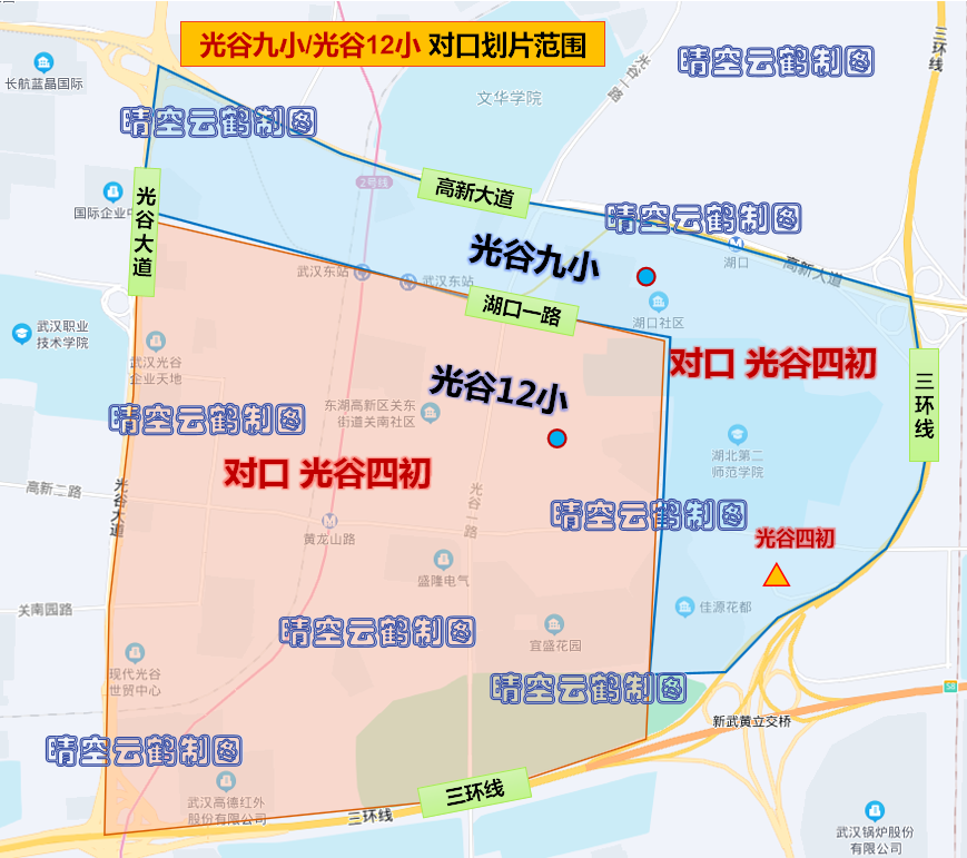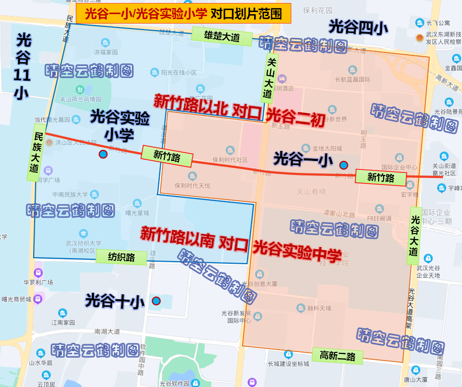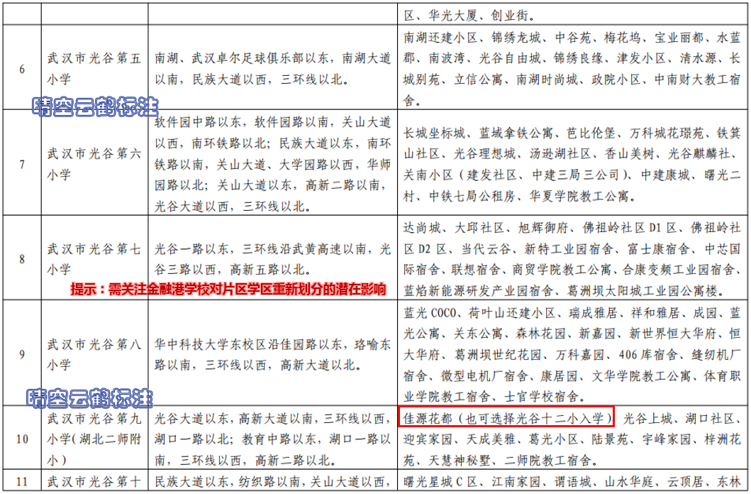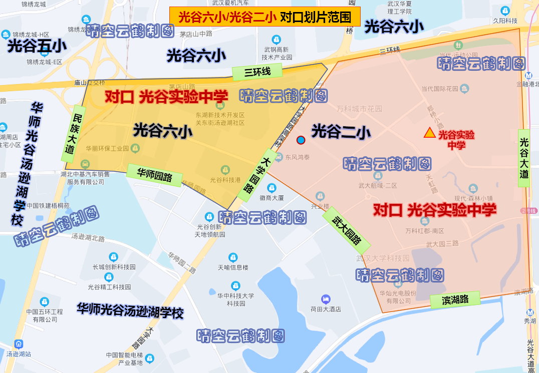 (注:包括光谷一小、光谷实验小学、光谷二小、光谷三小、光谷四小、光谷五小、光谷六小、光谷七小、光谷八小、光谷九小、光谷十小、光谷十一小、光谷十二小、光谷十四小、光谷十五小、光谷十六小、光谷十七小、光谷十八小、光谷二十一小、光谷二十五小、光谷二十六小、光谷二十七小、光谷汤逊湖学校小学部、华师附小,光谷实验中学、光谷一初、光谷二初、光谷三初、光谷四初、光谷八初、光谷汤逊湖学校南区初中部、光谷汤逊湖学校北区初中部、华科附中初中部等中小学对口小区楼盘范围)