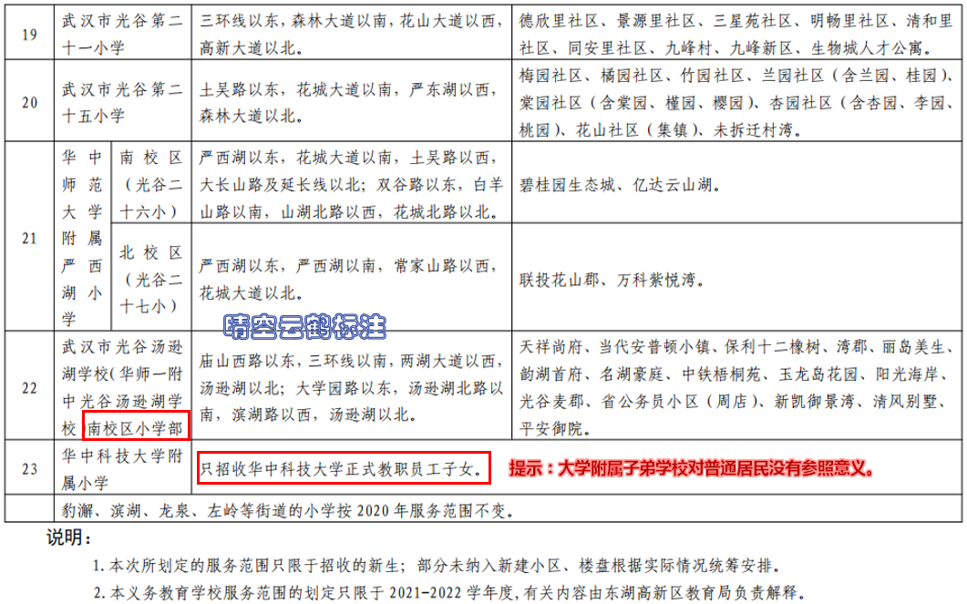 2021年5月31日《东湖高新区2021年度义务教育阶段学校服务范围》,对东湖高新区幼升小、小升初对口划片上学范围进行了明确的区分,晴空云鹤在此基础上进行了专门的分类、分片整理,具体如以下的图表所示。