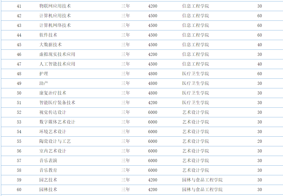 截至2021年1月,学院开设12个二级分院和2个教学部,设68个专科专业。