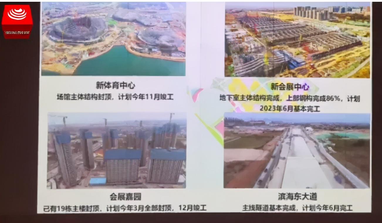 从曝光的视频信息可知,新体育中心:场馆主体结构封顶,计划今年11月竣工;新会展中心:地下室主体结构完成,上部钢构完成86%,计划2023年6月基本完工等,详情如下图。
