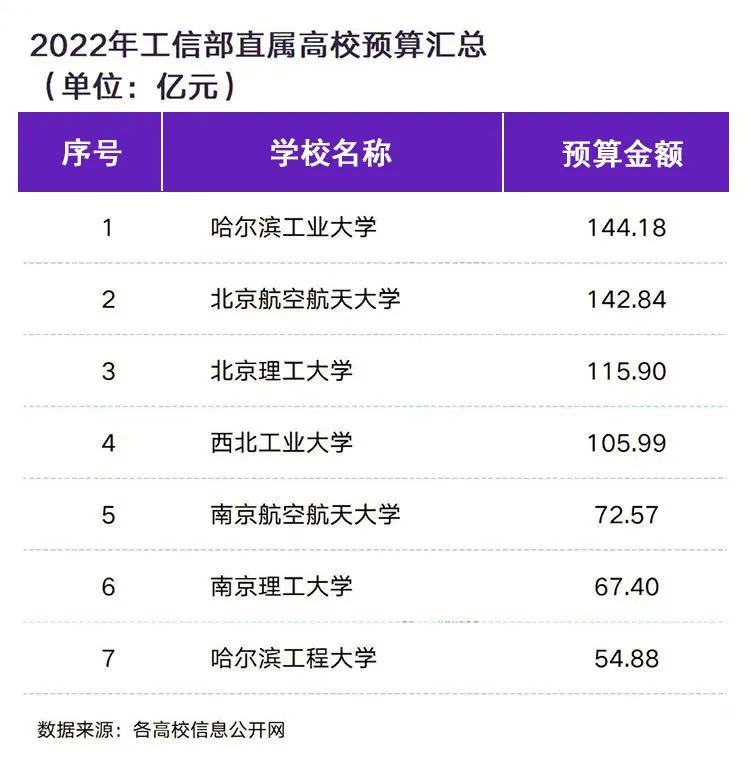 与2021年数据相比,2022年7所工信部直属高校经费预算都明显提高,国防七子的待遇明显得到了改善。其中,哈尔滨工程大学经费预算增加20.15亿元,涨幅为58.02%;哈尔滨工业大学增加36.15亿元,涨幅为33.46%;经费预算涨幅超过20%的工信部直属高校还有南京理工大学和北京航空航天大学。