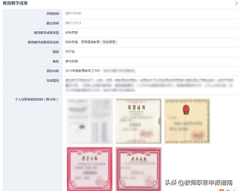 2、教育教学成效。申报人提供最低资历年限以来获得的综合荣誉(奖项)、管理奖或德育工作奖励、教学成果奖、教育教学奖励(包括本人参加或指导教师、学生参加比赛获奖2个方面)、其它教育教学奖项、荣誉、工作业绩等证明材料。(申报人在上报数额内按获奖层级从高到低上传证明材料,获奖层级包含校级、乡镇级、县级、市厅级、省部级、国家级等。)