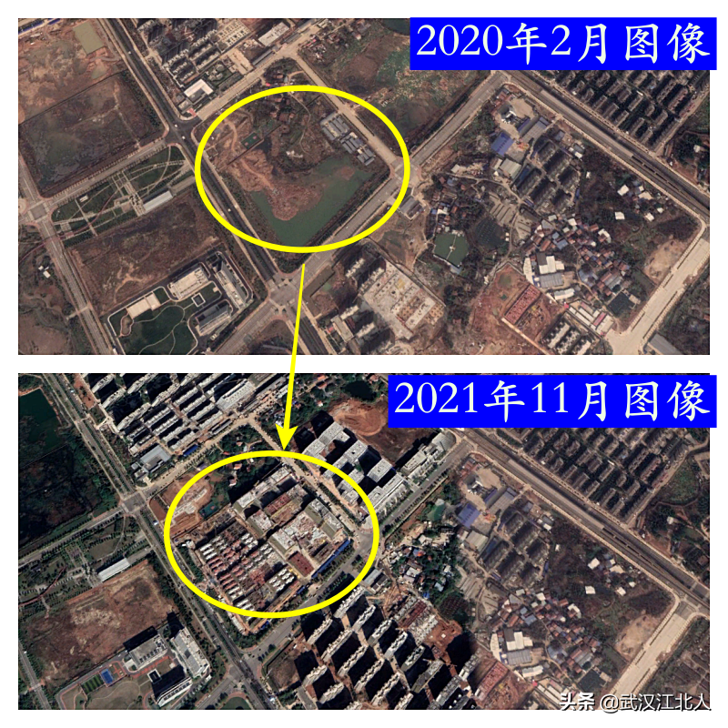 卫星地图记录了这个学校的建设过程,2020年2月拍摄的图片显示学校还没开工,2021年11月拍摄的照片里,康礼学校全部建筑都已开工接近封顶,建设速度确实很快。