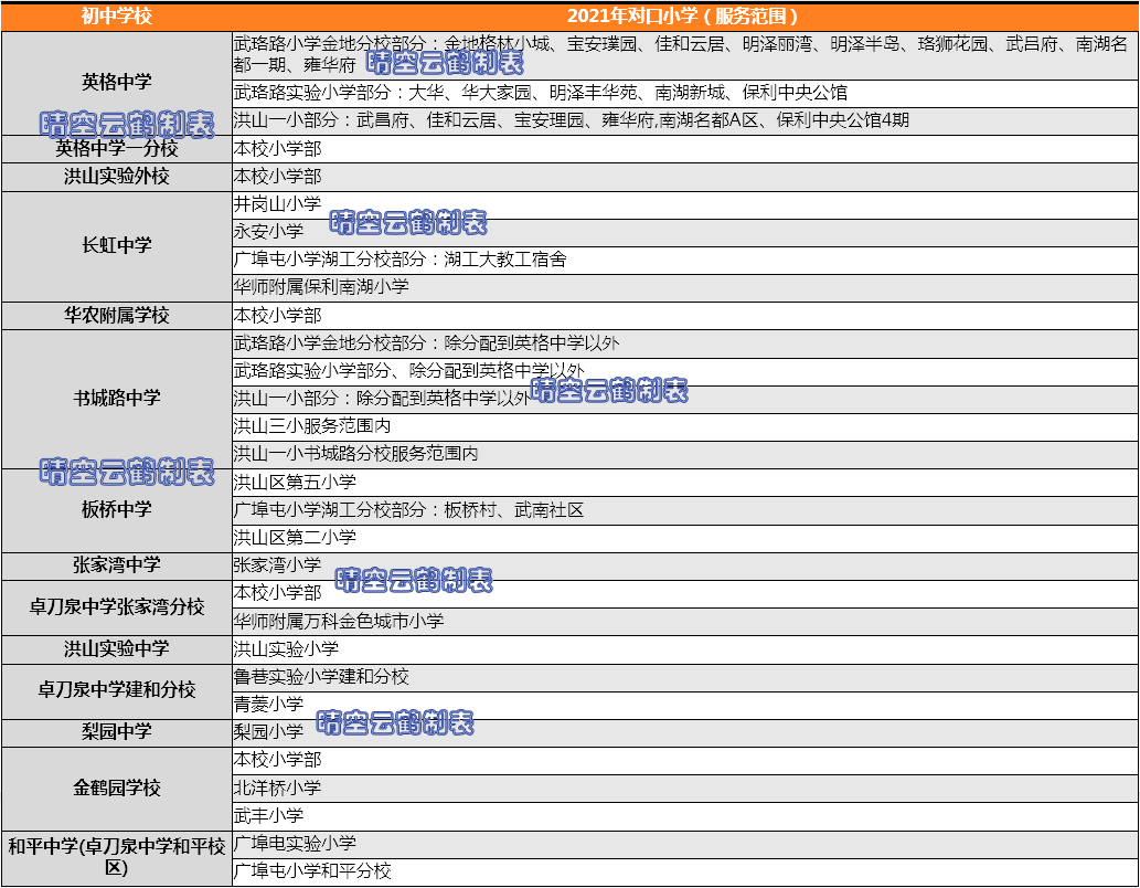 2021年5月31日的《洪山区教育局关于划分义务教育阶段学校2021年服务范围的通知》中,对洪山区幼升小、小升初对口划片上学范围进行了明确的区分。其中,“2021年小学对口初中入学服务范围”,晴空云鹤专门进行了分片整理,具体如下表所示;针对幼升小阶段的小学服务范围,由于涉及的道路、小区太多,一一整理起来的话,工作量太大,加上篇幅太长,本文暂不列入,以后有机会再补充。