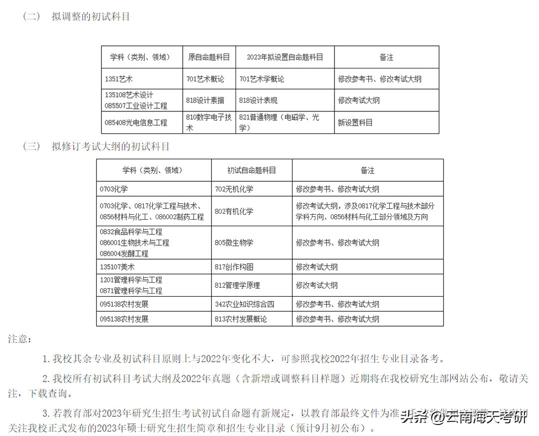 前几天给大家介绍不少今年在专业课上有更改的院校,其中也包括(云南大学)云南大学发布23考研自命题专业课修改通知!快看看里面是否有你的专业!今天在和小新老师一起看看,最近一周又有哪些院校发布初试科目调整的信息吧~