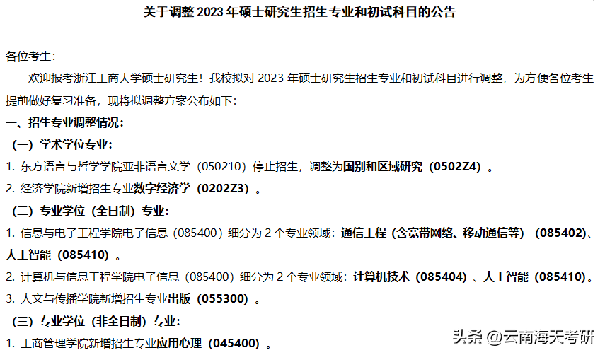 浙江工商大学发布关于调整2023年硕士研究生招生专业和初试科目的公告。