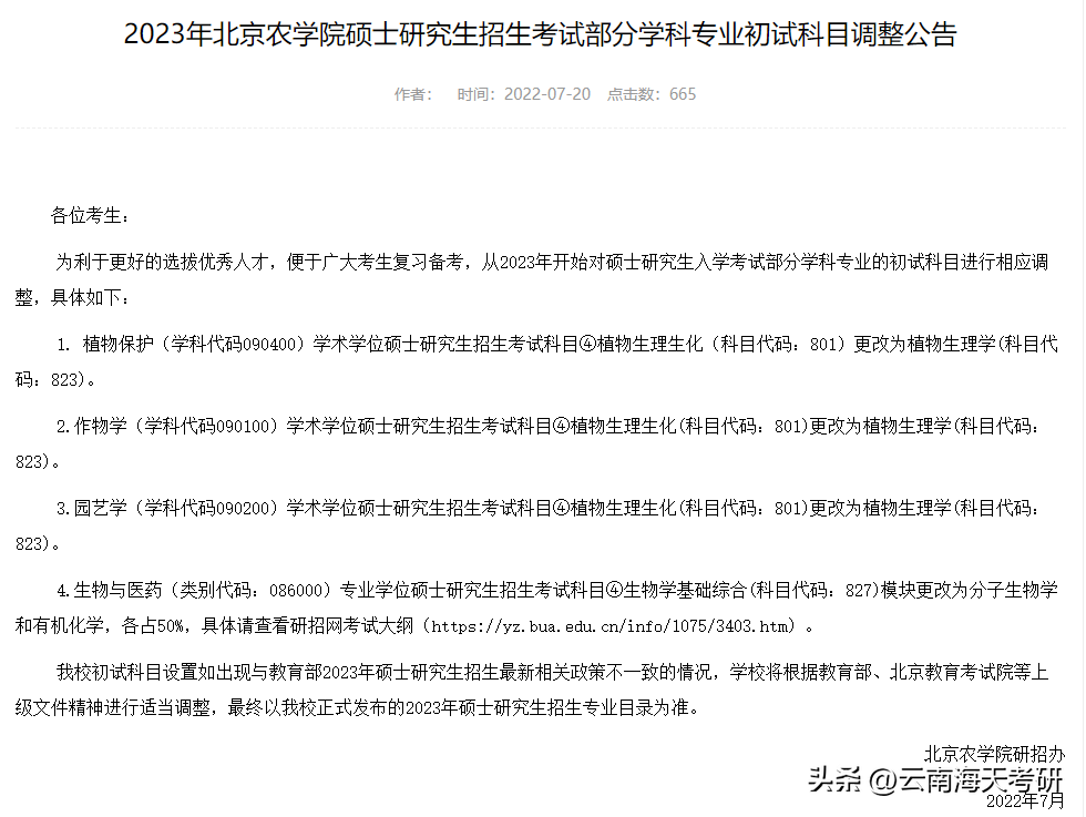 北京农学院发布2023年硕士研究生招生考试部分学科专业初试科目调整的公告。