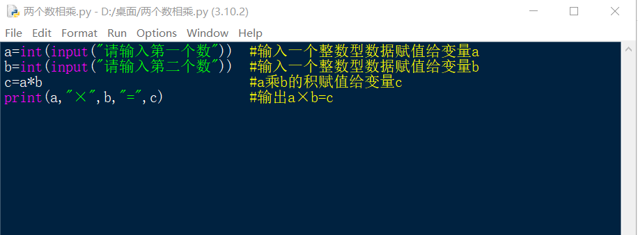 (四)两个数相乘 打开本题所在文件夹 C:\OMExam\python 中的"两个数相乘.py"文档,完成以 下操作: 该程序的功能是: 输入两个数,显示算式和计算结果。 请将①和②序号替换成正确代码,完善并调试运行程序,以实现其功能。 不要添加或删除程序行,也不要删除注释。
