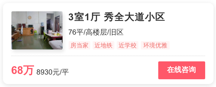 幸福里为你在花都找到了位于荣翠轩、秀全大道小区、银星花园、鼎信四季花园、东骏花园的5套非常抢手的低价三居室。以下将详细介绍这套位于秀全大道小区,总价为68万的3居室。从小区层面上看,秀全大道小区位于旧区。截止当前(2020年7月),小区均价为10451元/平方米,比旧区均价(17540元/㎡)低约7089元,比花都均价(16963元/㎡)低约6512元。从这套房源本身的卖点来看,广州市重点学校距离这套房所在地很近;出门后没走两步就能到达地铁站,想想都觉得幸福。推荐这套房还有一个原因,那就是,这套3居室绝不是“老破小”,相反,它的楼龄新,外观状况好。难怪,这套房最近这么受广州购房者关注。此外,该房源为小三居,好格局,好户型。有电梯,方便快捷,居住环境佳。点击以下房源卡片,即可查看房源照片及更多信息。