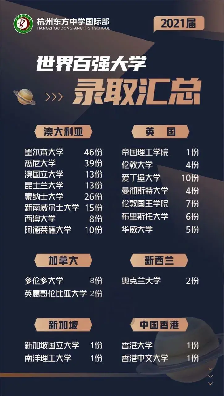 截至7月1日,杭州东方中学国际部2021届79名毕业生已收获230余份世界百强大学录取通知书。75%的学生收到了来自帝国理工学院、新加坡国立大学、墨尔本大学、悉尼大学、多伦多大学等世界排名前30强大学的录取通知书,100%的学生被世界百强大学录取。实现了多元、多方向、多通道升学,同时超四分之一的同学获得大学各类奖学金。