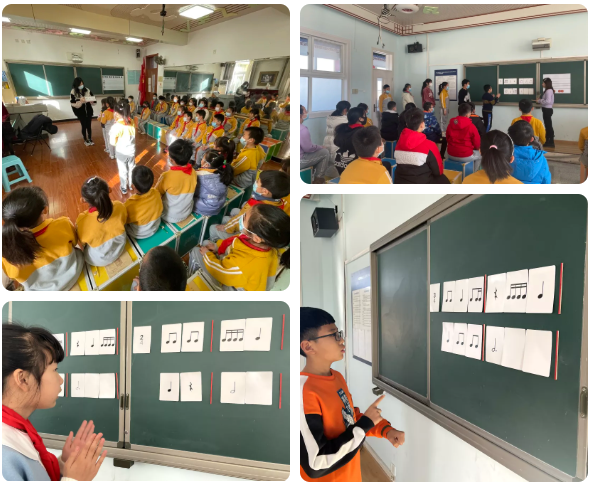 节奏测评:教师随机出示一条节奏型,学生手打稳定拍或手拍节奏,同时准确读出节奏。