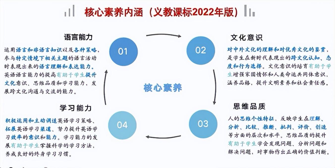 在2022年版课标中由四个方面共同构成核心素养的目标:语言能力是学科基础;文化意识体现价值取向;思维品质表现为心智特征;学习能力构成整个核心素养的发展条件。