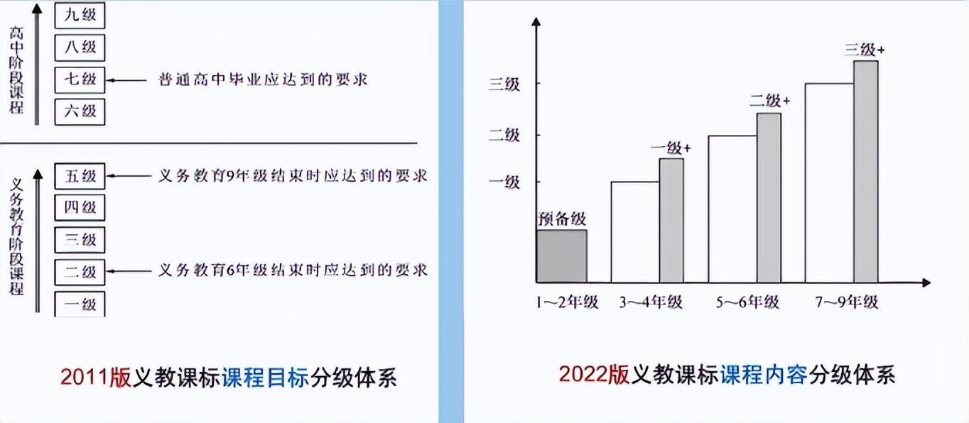 2022版课标在分级体系上进行了优化,将课程内容按学段划分三级体系,增强了体系性和指导性。同时还增加了“级别+”和“预备级”,考虑到了一、二年级的预备需求和学生起点不一样造成的需求差异。