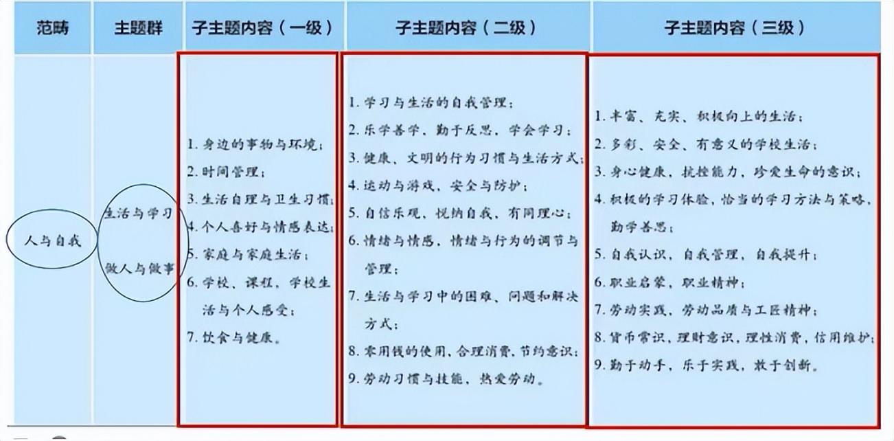 在主题的选择上可以看到有明显的有价值导向,例如在“人与自我”这一主题范畴内围绕着“生活与学习”“做人与做事”两个主题群细分三个级别的子主题内容,选材上的描写如时间管理、自我管理、善学乐学等都体现了明确的育人价值导向。