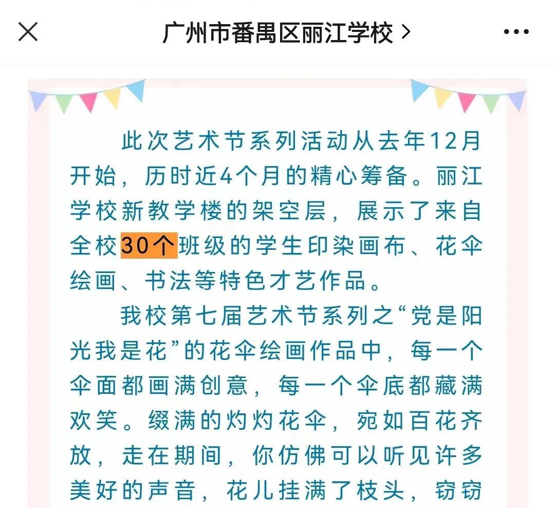 丽江学校公众号今年3月的推文表示其学校有30个班(图源:番禺丽江学校)