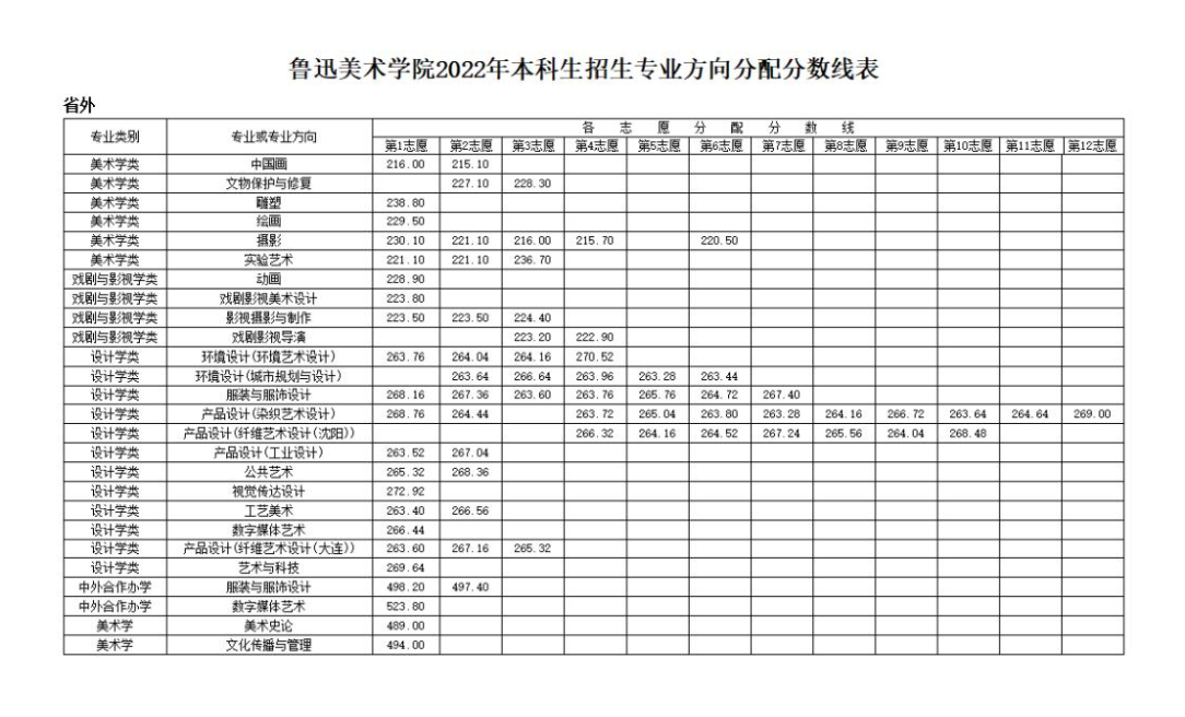 鲁迅美术学院公布了2022年各专业方向的分配分数线数据,一共有26个专业(方向)参与了分配。除美术学、艺术设计学、艺术管理等专业按高考文化成绩录取之外,中外合作办学专业是按专业成绩和高考成绩之和进行录取,设计学类与书法学专业按文化与专业成绩二八开进行加权排名录取,美术学类、戏剧影视学类和服装表演专业则直接按校考专业成绩排名录取。
