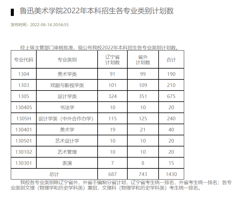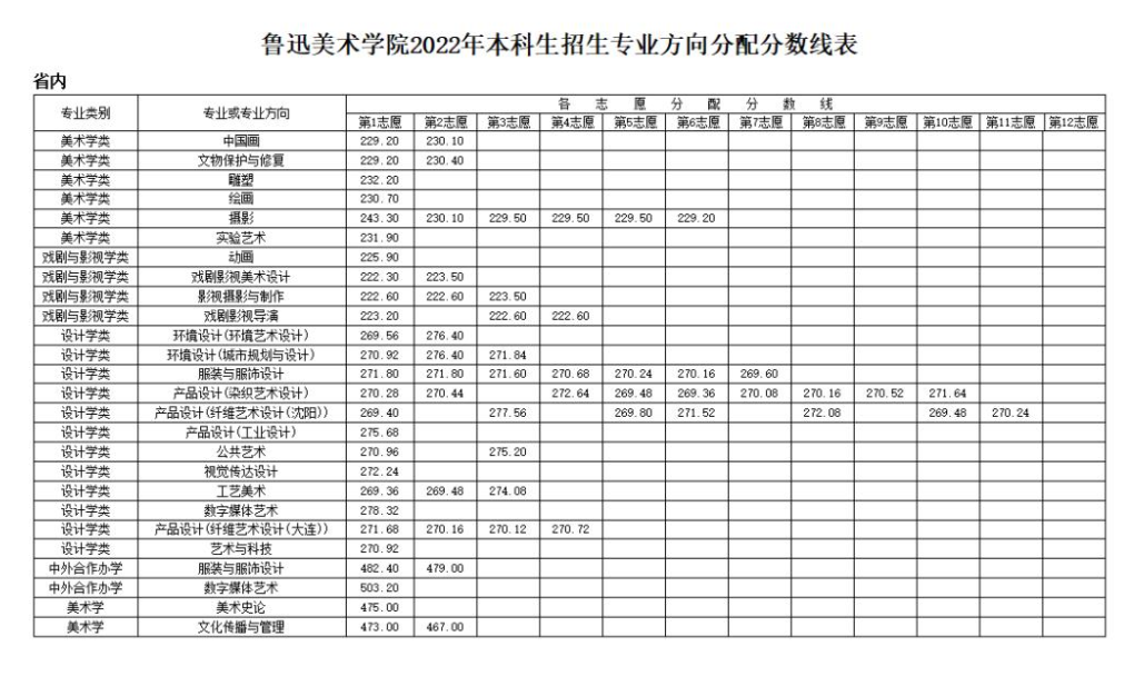 鲁迅美术学院2022年招生计划总人数为1430人,其中辽宁省内计划687人占48%多一点,辽宁省外计划人数为743人占52%。省外各专业录取分数线与省内是否一致?