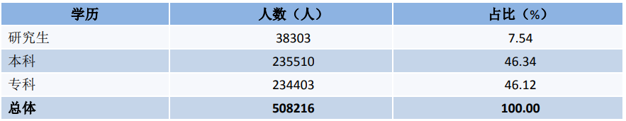 每年四川高考考生大约有一半是被专科批次录取,根据《四川省2021届高校毕业生生源信息与就业意向调查报告 》显示,四川省2021届高校毕业生共508216人,其中,研究生38303人,占比为7.54%;本科生235510人,占比为46.34%;专科生234403人,占比为46.12%。